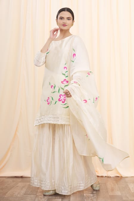 Off White Chanderi Lace Round Hand Painted Floral Kurta Sharara And Dupatta Set
