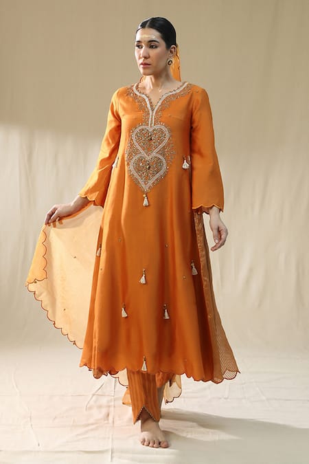 Buy_Arpita Sulakshana_Orange Chanderi Silk, Lurex, Cotton, Organza Tassels, Heart A-line Suit Set