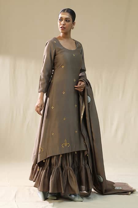 Buy_Arpita Sulakshana_Brown Chanderi Silk Gota Patti Round Neck Mocha Suit Set _Online_at_Aza_Fashions