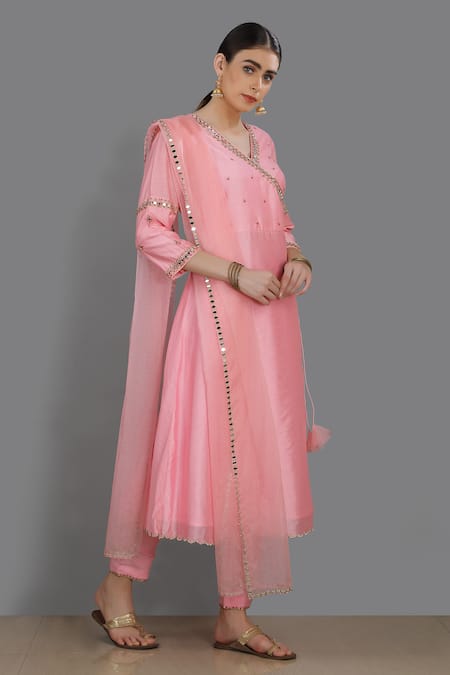 Pink Cotton Pant Mul Cotton Dupatta Organza, Kurta Chanderi Angarkha Set