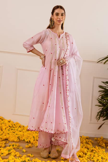 Pink Chanderi, Organza Embroidery, Zari Split V-neck Booti And Anarkali Set