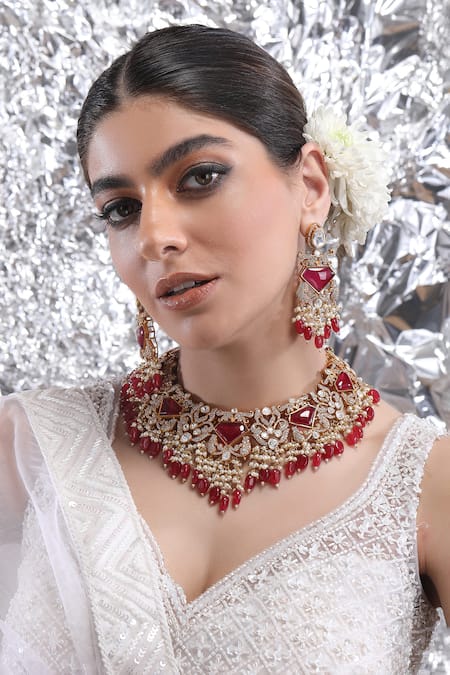 Red Beads, Diamonds Carved Cutwork Necklace Set