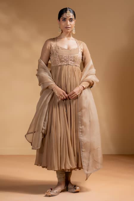 Beige Chiffon, Muslin, Satin, Lycra, Prakriti Embroidered Jacket And Anarkali Set