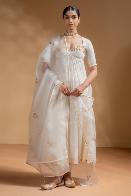 Off White Chanderi, Satin, Lycra, Organza Sharanya Work Tiered Anarkali Set