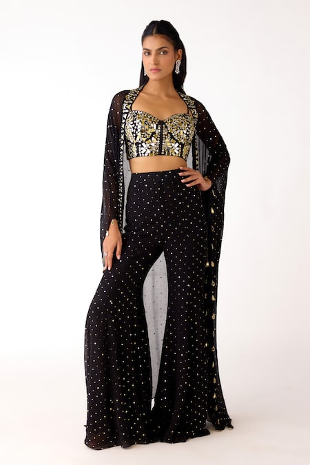 Gold Georgette, Mukaish Mirrors, Zari, Embroidery Sweetheart Cape Sharara Set