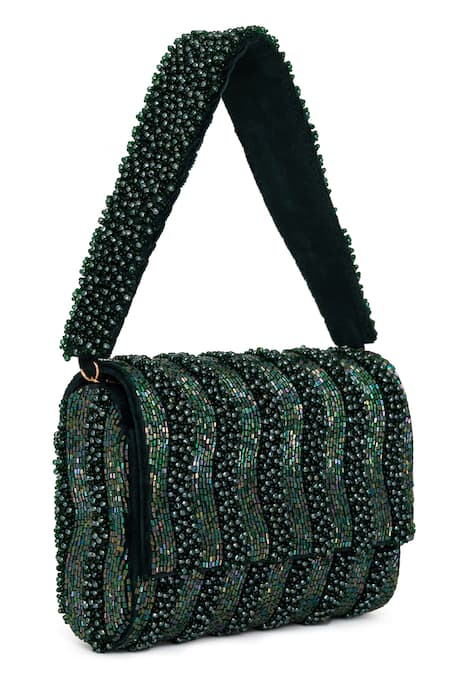Emerald Green Crystal Noor Embellished Clutch With Sling Chain