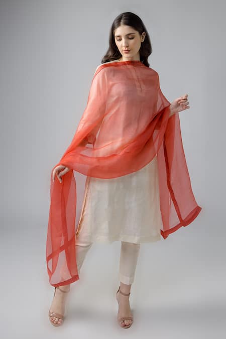 Off White Tussar, Organza Round Neck Placed Tie-dye Kurta Trouser Set