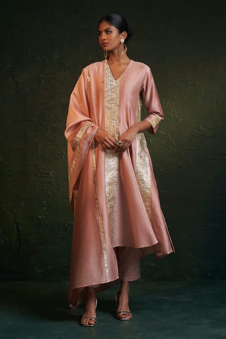 Pink Chanderi, , Satin Gota Patti Crinkled Paneled Anarkali Set