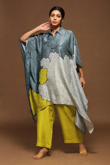 Blue Dupion Silk Abstract Collared Neck Printed Kaftan Kurta And Pant Set