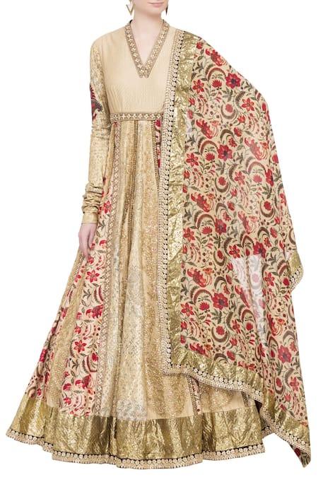 Beige Chanderi Floral, Sequin V Neck Embellished Anarkali Kurta