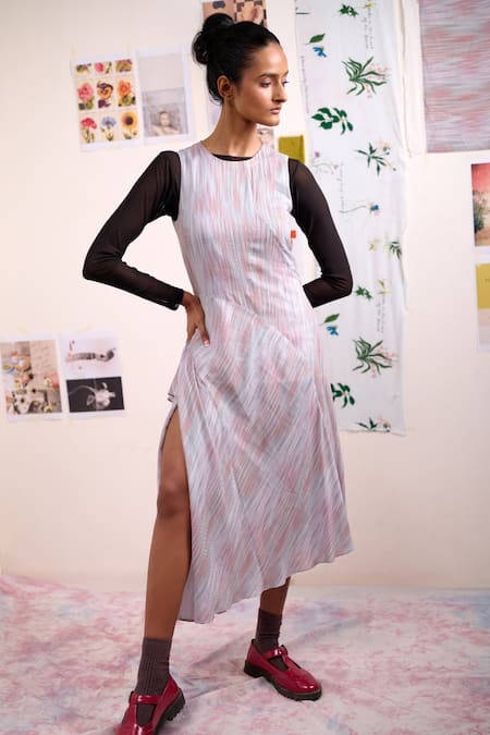 Multi Color Modal Round Neck Heron Stripe Pattern Dress