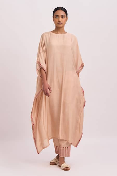 Beige Cotton Silk Resham And Kasab Work Round Kaftan Kurta & Pant Set