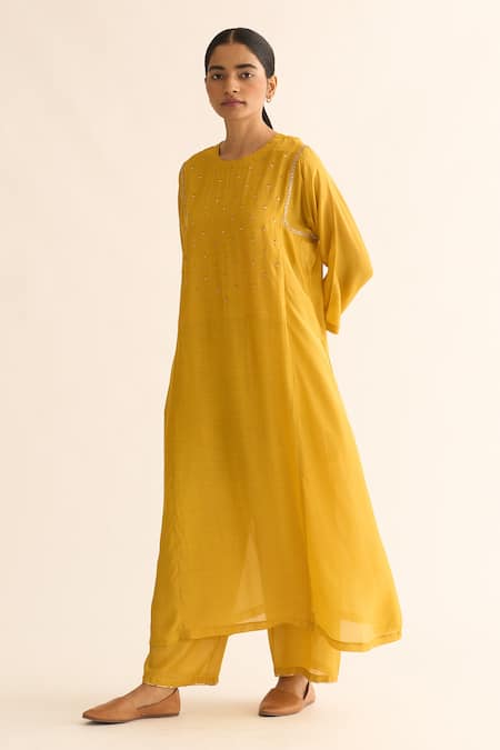 Yellow Cotton, Silk Embroidery Round Neck Yoke Kurta And Pant Set