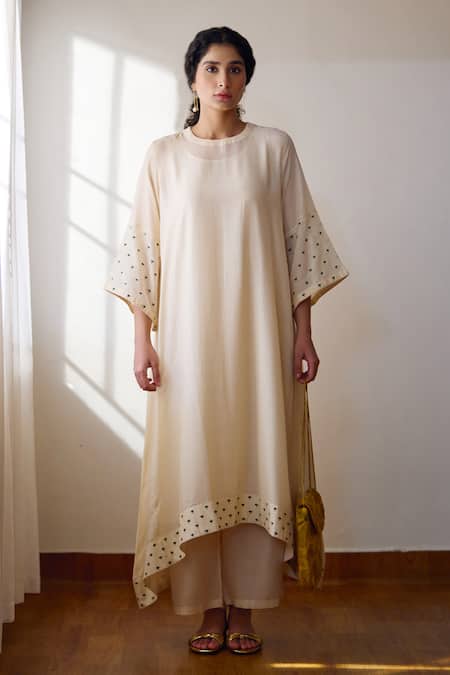 Ivory Cotton, Silk Embroidery Round Neck Fleaur Kurta And Pant Set