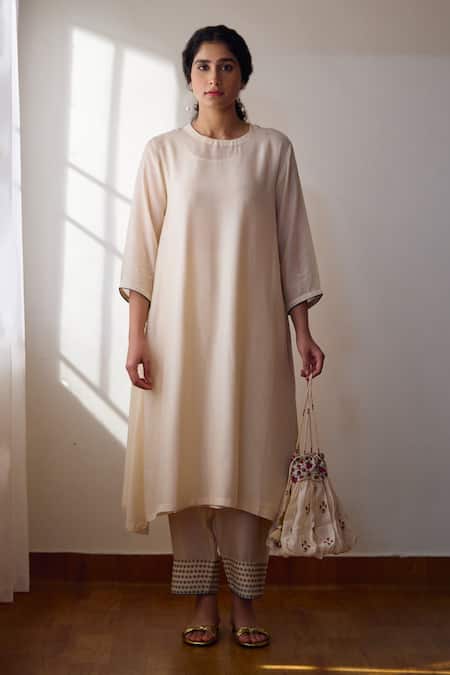 Ivory Cotton, Silk Embroidery Round Neck Gia Pocket Kurta And Pant Set