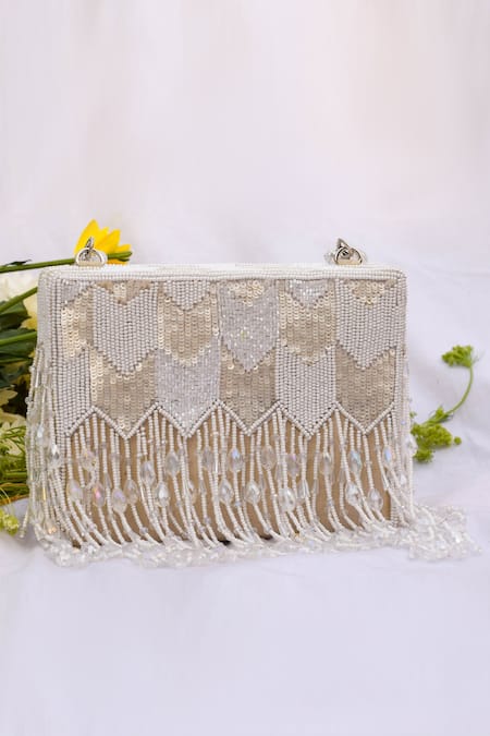 White Embroidered Dishi Tassel Clutch With Sling