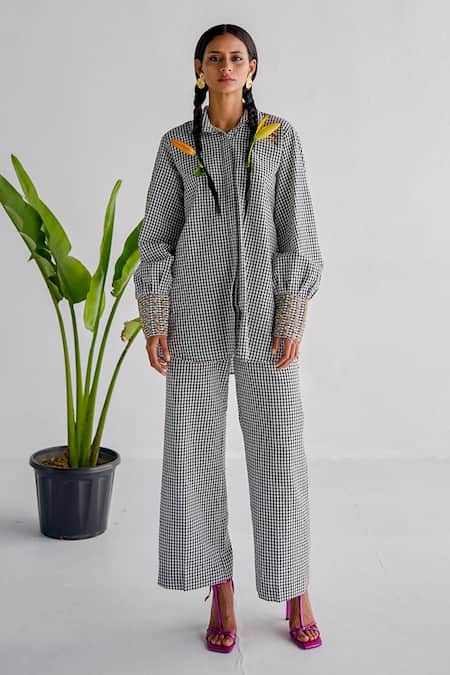 Black Cotton Embroidery Shawl Neck Aari Shirt And Pant Set