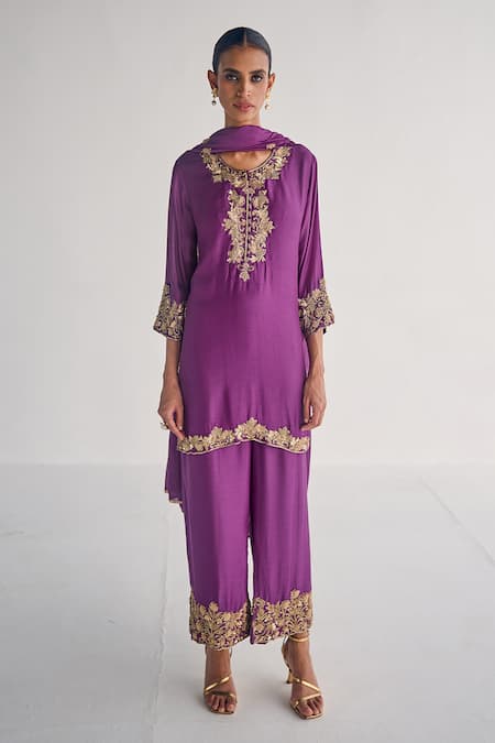 Purple , Silk, Satin Embroidery, Zari Floral Straight Kurta Set