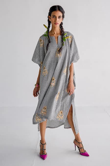 Black Cotton Embroidery Split V-neck Zardosi Kaftan