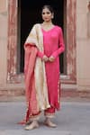 Coral Silk, Tissue Pom-poms V-neck Textured Metallic Pink Kurta Set