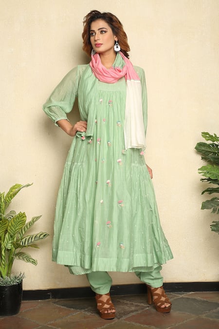 Green Inner Slip Zari Butti Mal, Kurta , Scarf Set