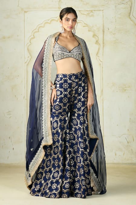 Blue Tussar, Organza Embroidery, Sequins, Zari V-neck Farhat Blouse Sharara Set