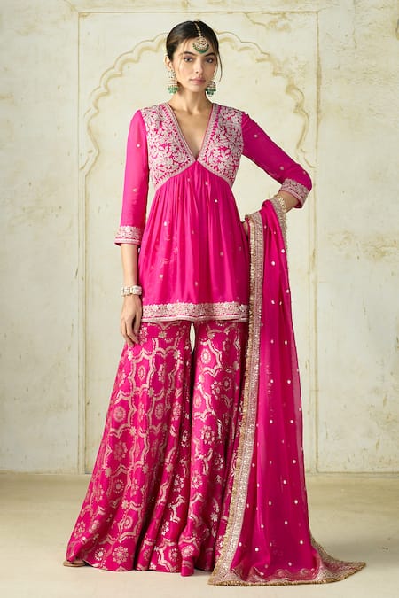 Buy_Gopi Vaid_Pink Tussar, Georgette Embroidery, Zari, Sequins Rida Peplum Kurta Sharara Set _at_Aza_Fashions