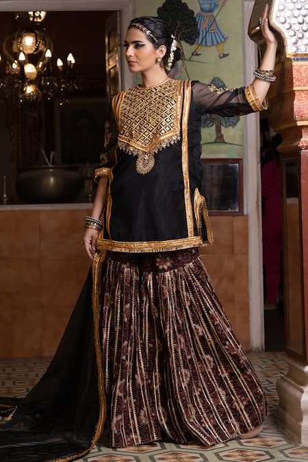 Black Organza Sequins, Zari, Gota Aasman Yoke Embroidered Kurta Sharara Set