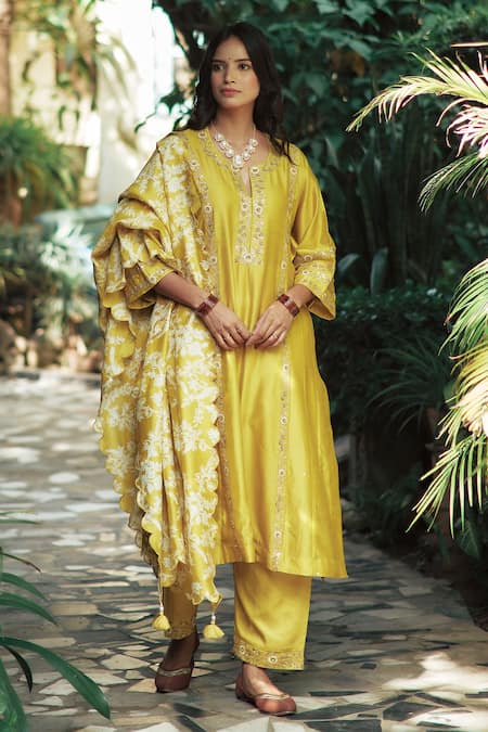 Yellow Bottom Cotton Satin, Kurta And Dupatta Chanderi Notched Set