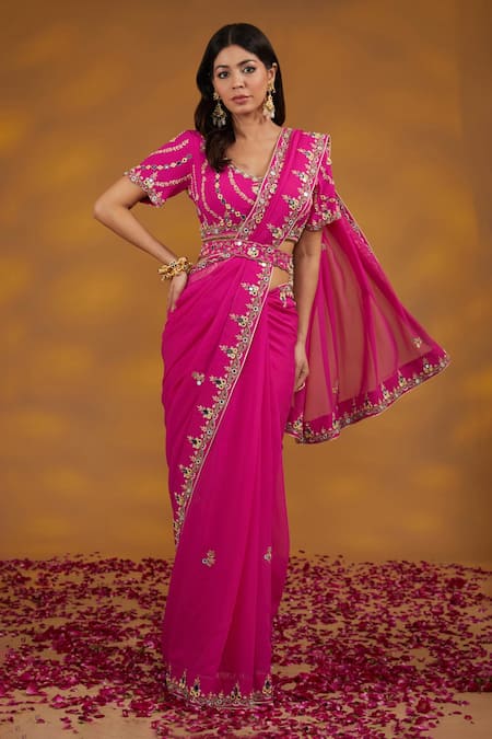Pink Georgette, Silk Embroidery, Gota Floral Border Work Saree With Blouse