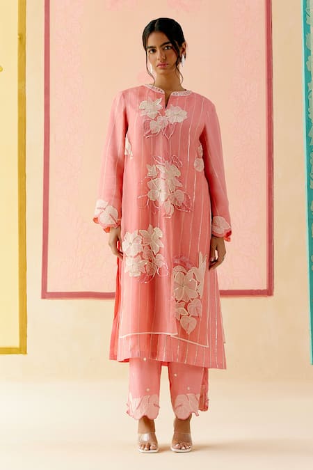 Pink Silk Organza Applique, Sequins Split V-neck Dahlia Layered Kurta Set