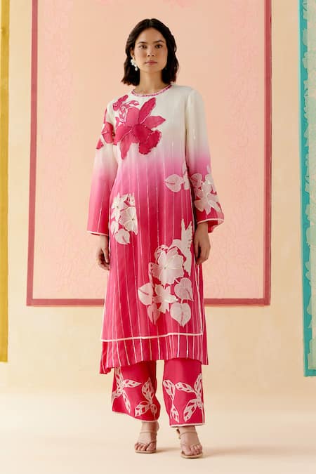 Pink Silk Organza Applique, Embroidery, Sequins Rose Ombre Layered Kurta Set
