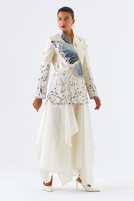 Ivory Chanderi Silk Cut Work, Embroidery Cutwork Jacket With Draped Kurta