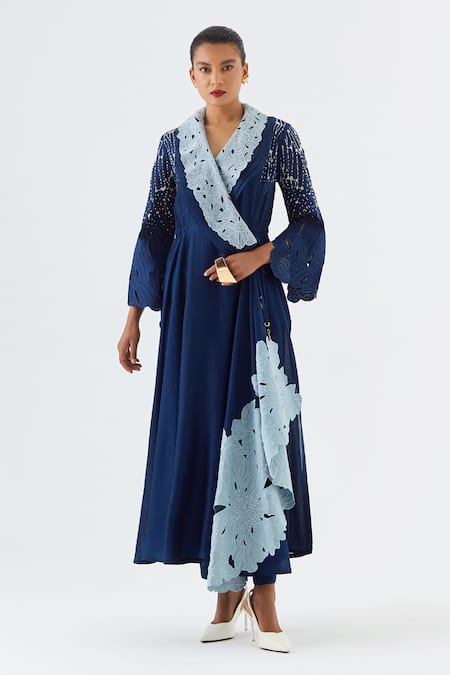 Blue Organza, Chanderi Embroidery, Layered Overlap Angarkha And Pant Set