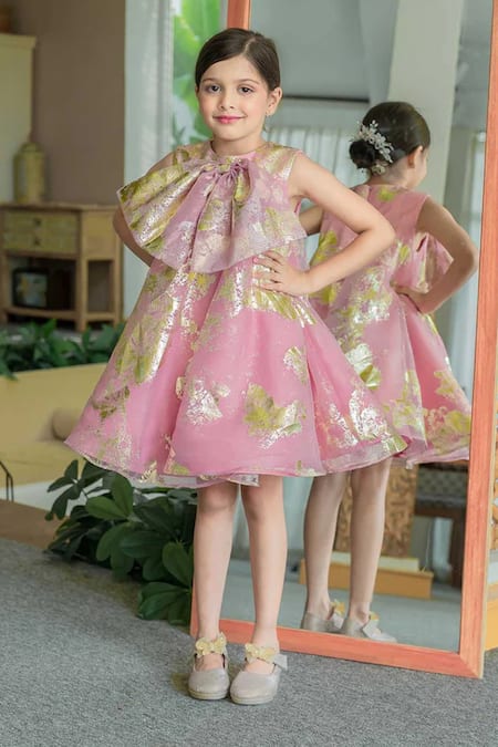 Pink Organza, Silk, Net, Shantoon Bows, Foil Printing A-line Dress