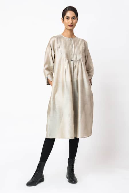 Beige Chanderi Silk Embroidery Round Neck Latte Tunic