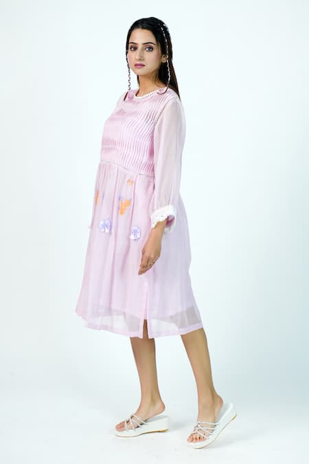 Pink Kota Doria Applique Round Neck Sugar Rose Pleated Bodice Tunic Dress