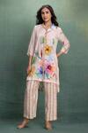 Beige Cotton Collared Digital Print Kurta And Pant Set