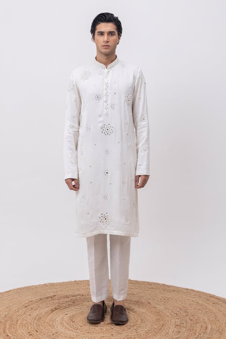 Ivory Linen, Satin, Cotton Mirrors Chaand In Paradise Kurta And Pant Set