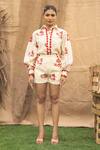 Red Cotton Embroidery Collared Floral Shirt And Shorts Set