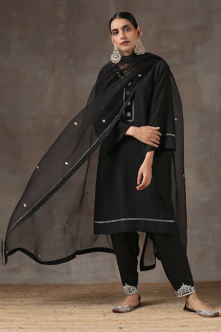 Black Satin, Silk, Tussar Embroidered Kurta Set