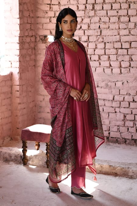 Pink Chanderi Sequins V-neck Plain A-line Kurta Pant Set