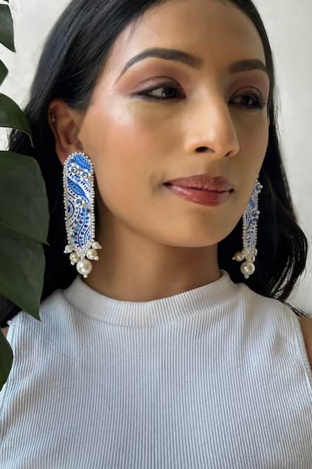 Blue Sequins, Beads, Pearls Muse Handpainted Earrings