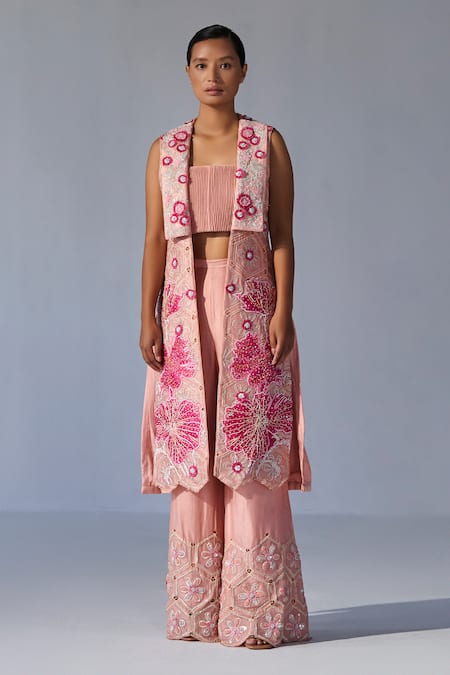 Pink Silk Embroidery, Sequins Open , Square Floral Jacket Pant Set