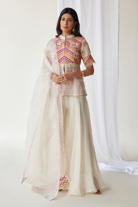 Off White Organza Zari, Sequins Zardozi Embroidered Peplum Top Sharara Set