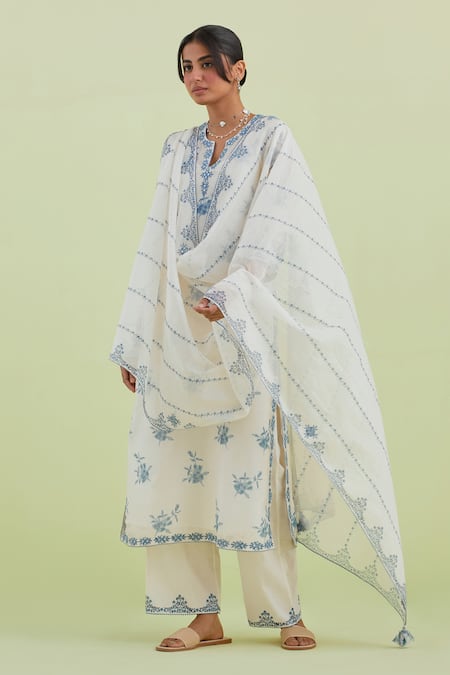 Off White Silk, Chanderi, Cotton Mirrors, Hand Block Print Kurta Pant Set