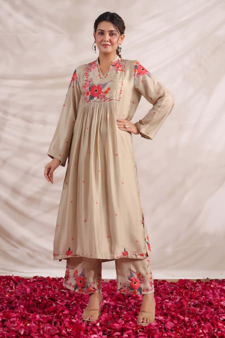 Ivory Silk Sequins, Beads, Bahaar Gathered Printed Kurta And Palazzo Set