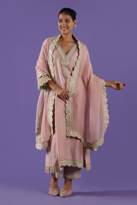 Blush Chanderi Zari, Tassels V-neck Pink Tilla A-line Set
