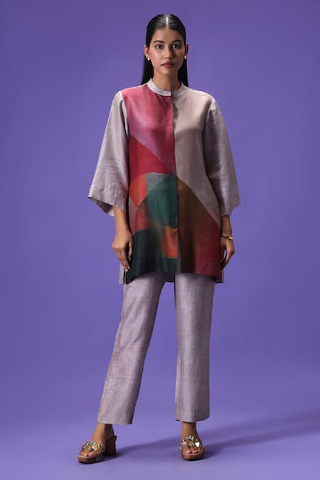 Multi Color Silk Round Neck Dusky Petals Printed Kurta Set