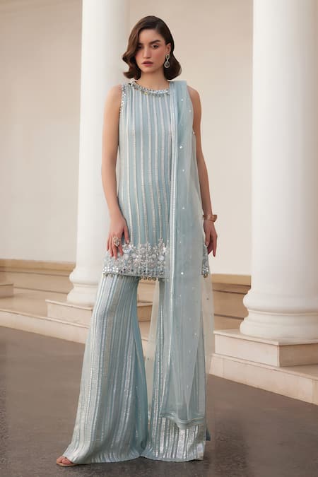 Blue Georgette Mirrors, Zari Round Neck Powder Embellished Kurta Set